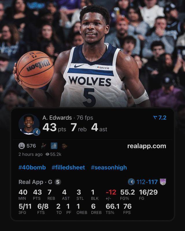 安东尼·爱德华兹轰下了43分,这照旧是他流畅第二场比赛砍下40+,他成为了NBA历史未满25岁拿到40+次数第四多的球员,仅次于乔丹、科比和麦迪。但这么的发扬却无法让他成绩一场顺利,甚而丛林狼输球的形式齐和上一场相同令东说念主无法意会。